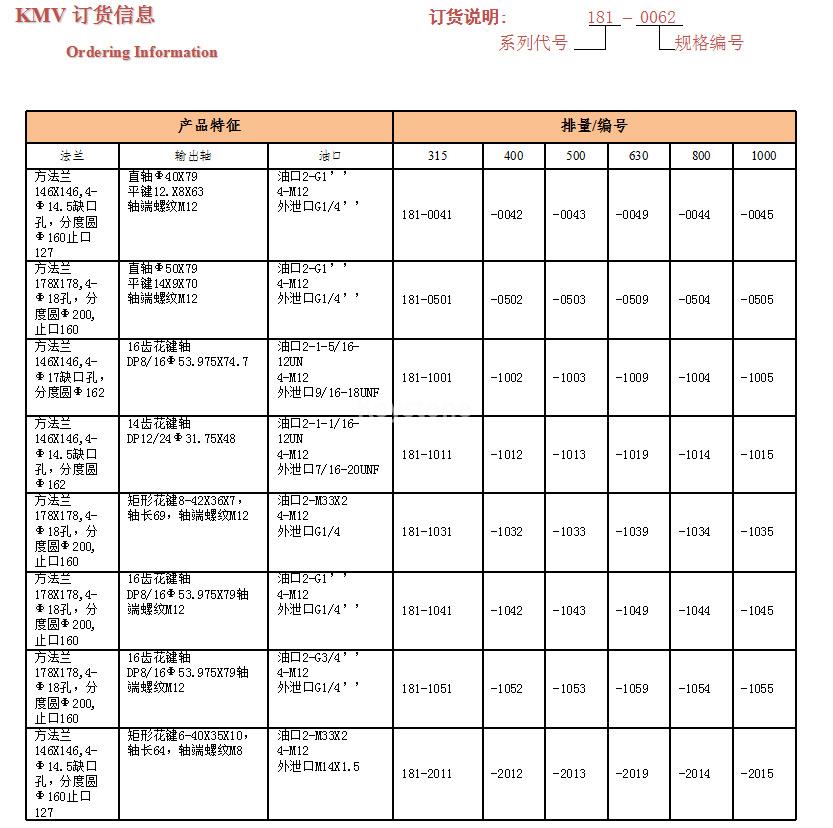排量(ml/r) | 315 | 400 | 500 | 630 | 800 | 1000 | |